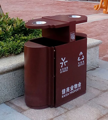 欣方圳戶外鋼制垃圾桶,品質卓越,工藝領先,雙桶分類推蓋投口設計,頂端不銹鋼煙灰缸!