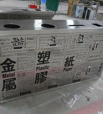 • 產品材質:不銹鋼五分類環保回收箱采用201#,202#,304#優質不銹鋼材料模壓成型,堅固耐用,不易破損;耐火安全,抗高低溫,適合各種惡劣氣候條件;金屬亮澤,高雅美觀,廣泛適用于各種場所;內外表面光潔,減少垃圾殘留,易于清潔;配置鍍鋅板內桶,便于垃圾清倒;